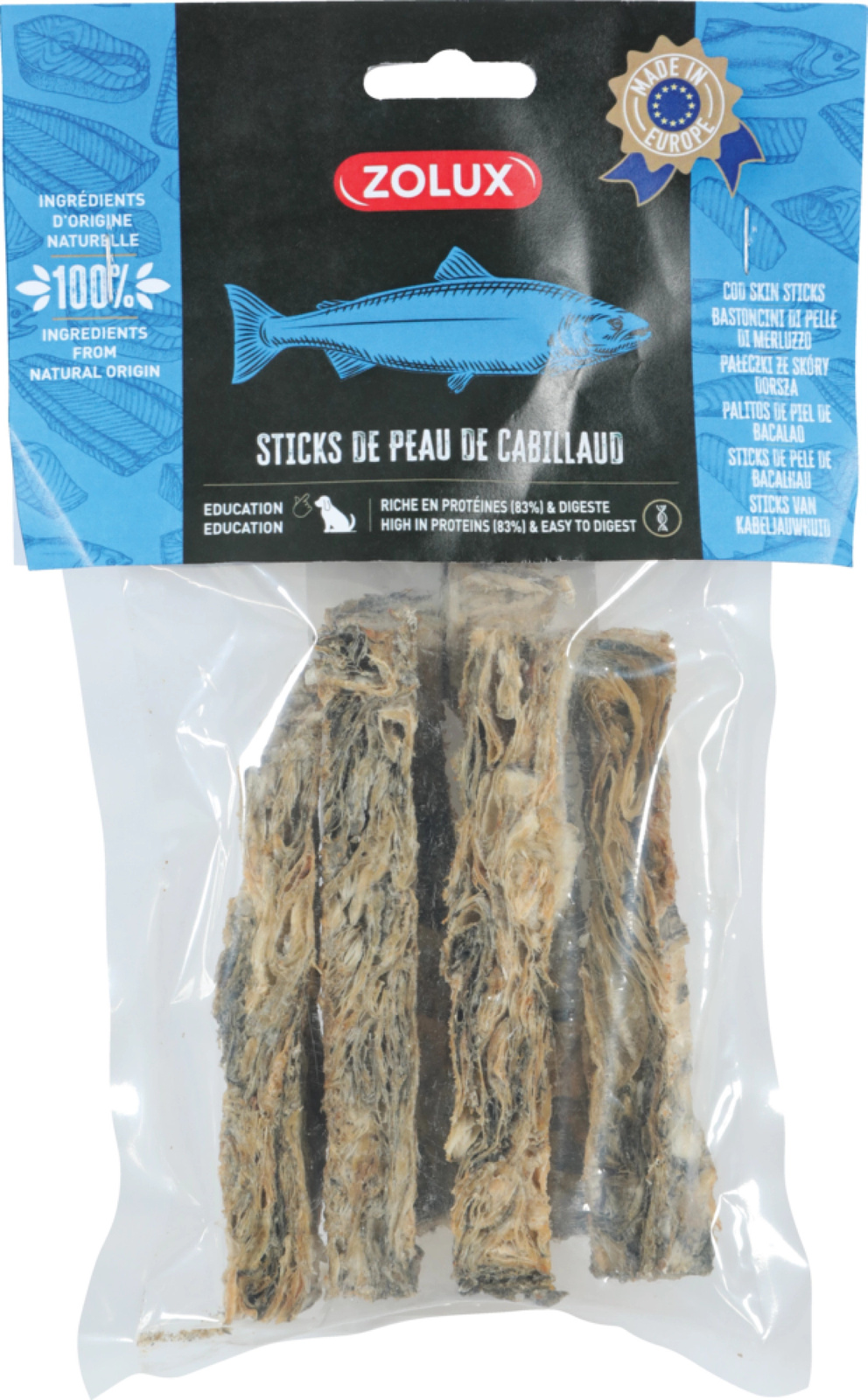 Naturalne pałeczki ze skóry dorsza marki ZOLUX to zdrowa i smaczna przekąska, która doskonale uzupełnia codzienną porcję pożywienia. Wytwarzane ręcznie i suszone w specjalnym procesie, zapewniają wysoki poziom wartości odżywczych i wyjątkowy naturalny aromat, które pokocha każdy pies.