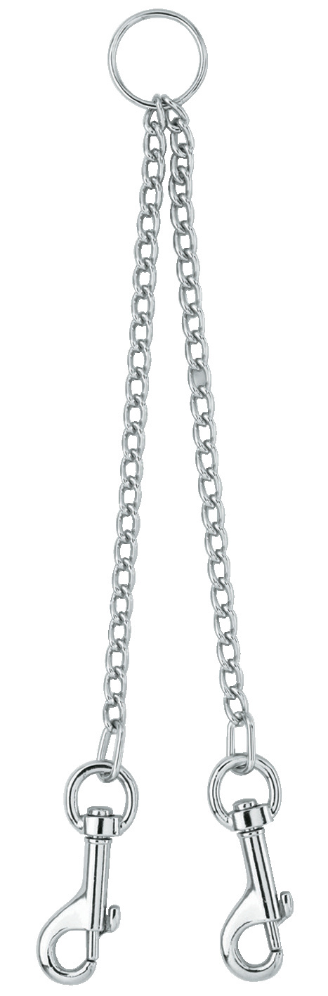 Praktyczny i gustowny łącznik do smyczy umożliwia spacer z dwoma psami na jednej smyczy. Ten metalowy łącznik składa się z pierścienia przyłączonego do smyczy oraz 2 karabińczyków, do przypięcia obroży dwóch psów.