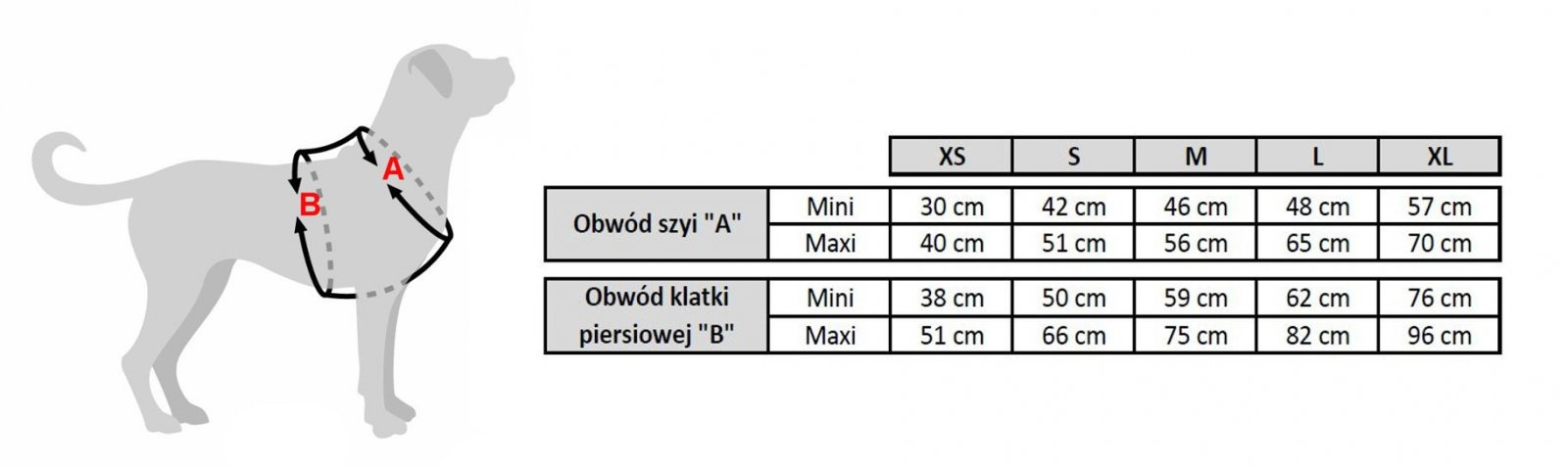 Rozmiar XL przeznaczony jest dla psów o obwodzie szyi między 57 cm a 70 cm oraz obwodzie klatki piersiowej od 76 cm do 96 cm. Dzięki precyzyjnym wymiarom szelki doskonale leżą na ciele psa, nie krępując jego ruchów. ✂
