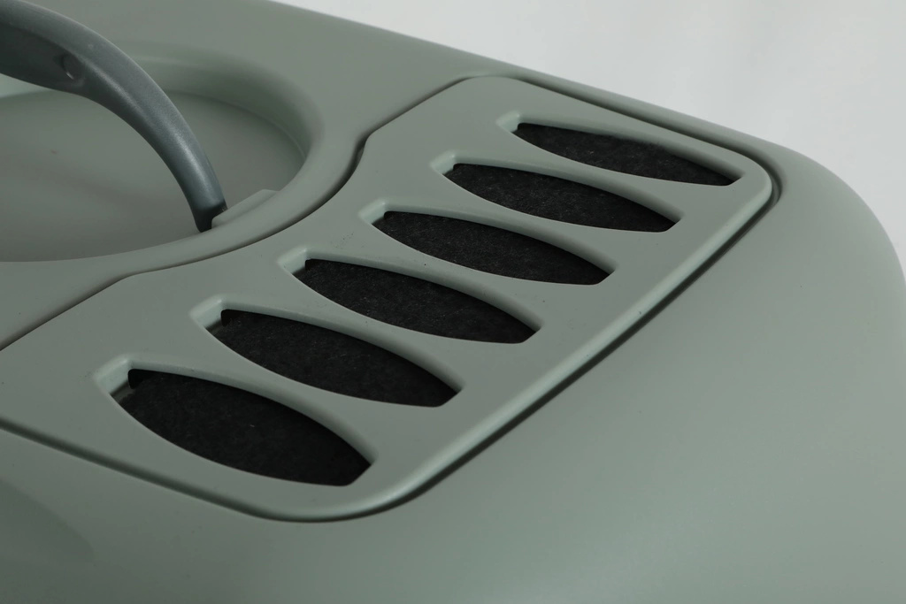 Toaleta została wyposażona także w filtr węglowy, neutralizujący nieprzyjemne zapachy. Wysoki brzeg kuwety zapobiega wydostawaniu się żwirku na zewnątrz.