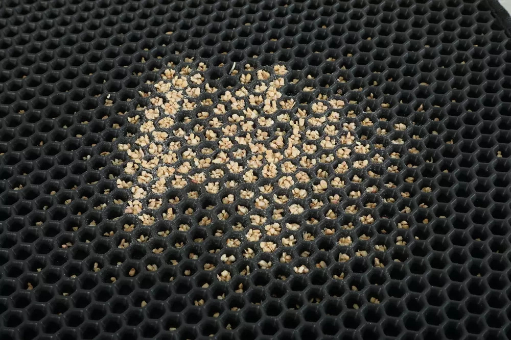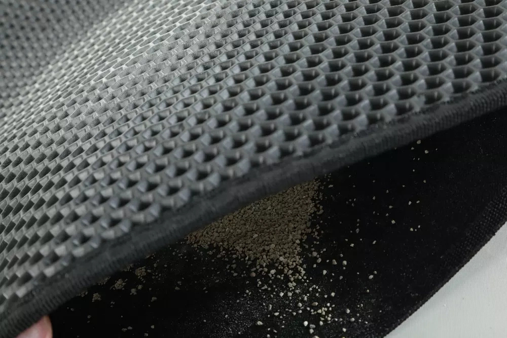 Dwuwarstwowa mata pod kuwetę dla kota to praktyczny i skuteczny sposób na wyeliminowanie rozsypanego żwirku i utrzymanie idealnej higieny. Struktura produktu przypomina plaster miodu i umożliwia zatrzymywanie ziarenek żwirku, które wychwytywane są przez wyżłobienia w tkaninie. Zapobiega to rozprowadzaniu żwirku w pomieszczeniach i sprzyja zachowaniu czystości wokół toalety zwierzęcia. Mata składa się z dwóch części: gładkiego, wodoodpornego dywanika oraz tkaniny o budowie plastra miodu. Gdy zwierzę przechodzi przez matę, ziarenka żwirku wpadają przez otwory wierzchniej tkaniny i są uwięzione wewnątrz produktu. W celu wyczyszczenia maty wystarczy ją otworzyć, oddzielając część z otworami od części gładkiej i wysypać nagromadzony żwirek prosto do kosza. Produkt został zatwierdzony przez lekarza weterynarii i jest odpowiedni do każdego rodzaju kuwet i toalet oraz każdego rodzaju żwirku. Dostępny w trzech rozmiarach (35x45cm, 40x55cm i 45x65cm).