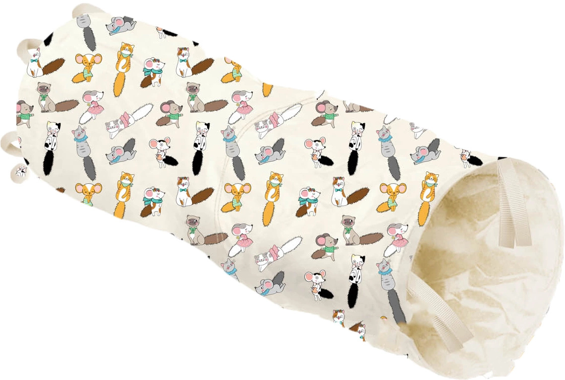 Zastosowanie i zalety: Tunel Chatouille z wzorem kotów i myszy idealnie sprawdzi się jako centralny element strefy zabaw dla kotów domowych, oferując wieloaspektową stymulację behawioralną. Może być używany jako samodzielna zabawka do eksploracji i ukrywania się, element większego systemu tuneli tworzącego skomplikowany tor zabaw, lub przenośna zabawka do wykorzystania w różnych pomieszczeniach domu.